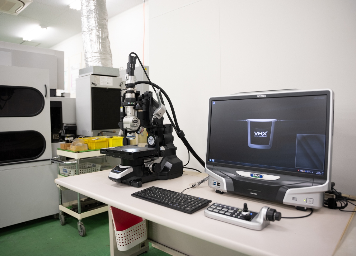 タカタ精密では、マイクロスコープで刃先を確認しながら研磨を進め、職人が一つひとつの刃を丁寧に仕上げています。