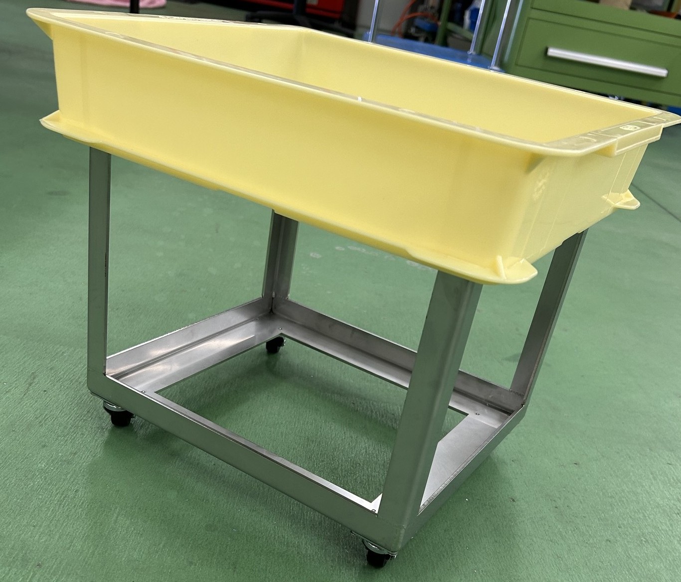 医薬品メーカー様の現場担当者より使用イメージをお伺いし、コンテナ搬送用カートを設計・製作しました。現場の作業性を考慮し、サイズ・高さ・剛性を最適化。弊社にて図面化から部材調達、組立まで一貫対応しています。